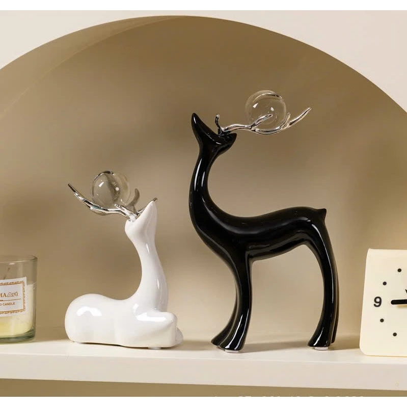Set hươu tài lộc đen trắng decor kệ tủ sang trọng